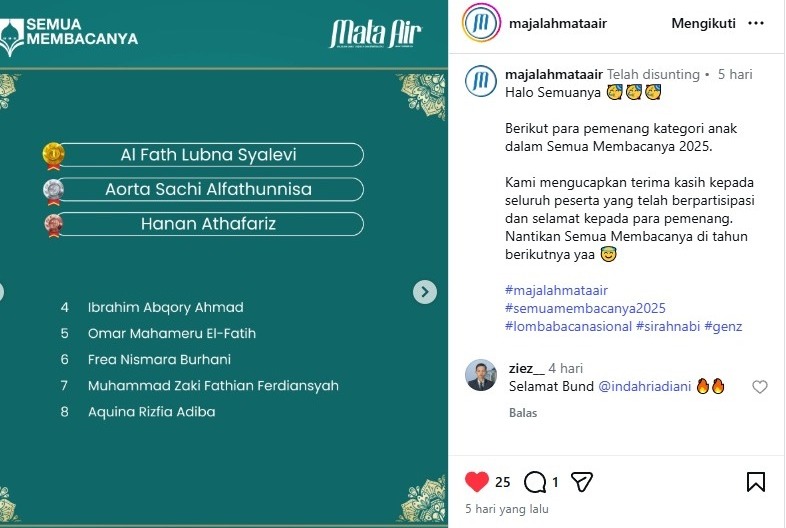 Berdasarkan pengumuman resmi dari Majalah Mata Air, berikut para pemenang kategori anak Lomba “Semua Membacanya” 2025: