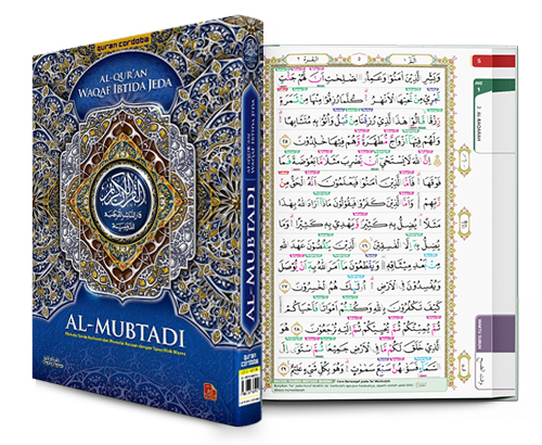 Mushaf AL-MUBTADI KODE TAJWID PRAKTIS adalah Al-Quran belajar tilawah yang disajikan dengan khat Rasm Utsmani Standar Indonesia (MSI) dengan panduan warna tajwid standar Kementerian Agama RI serta panduan waqaf Ibtida (berhenti dan memulai bacaan) dan tanda waqaf jeda. Selain itu mushaf Al-Qur’an ini dilengkapi dengan panduan bacaan berupa Kode Tajwid Praktis untuk memandu pembaca bertilawah sesuai dengan kaidah hukum tajwid dan juga panduan khatam1 bulan dengan fitur ODOJ (One Day One Juz). Mushaf ini pun diperkaya dengan pembahasan materi tajwid metode warna yang terdapat dalam setiap halaman. Ukuran A5 yang compact menjadi salah satu keunggulan Al-Qur’an ini.